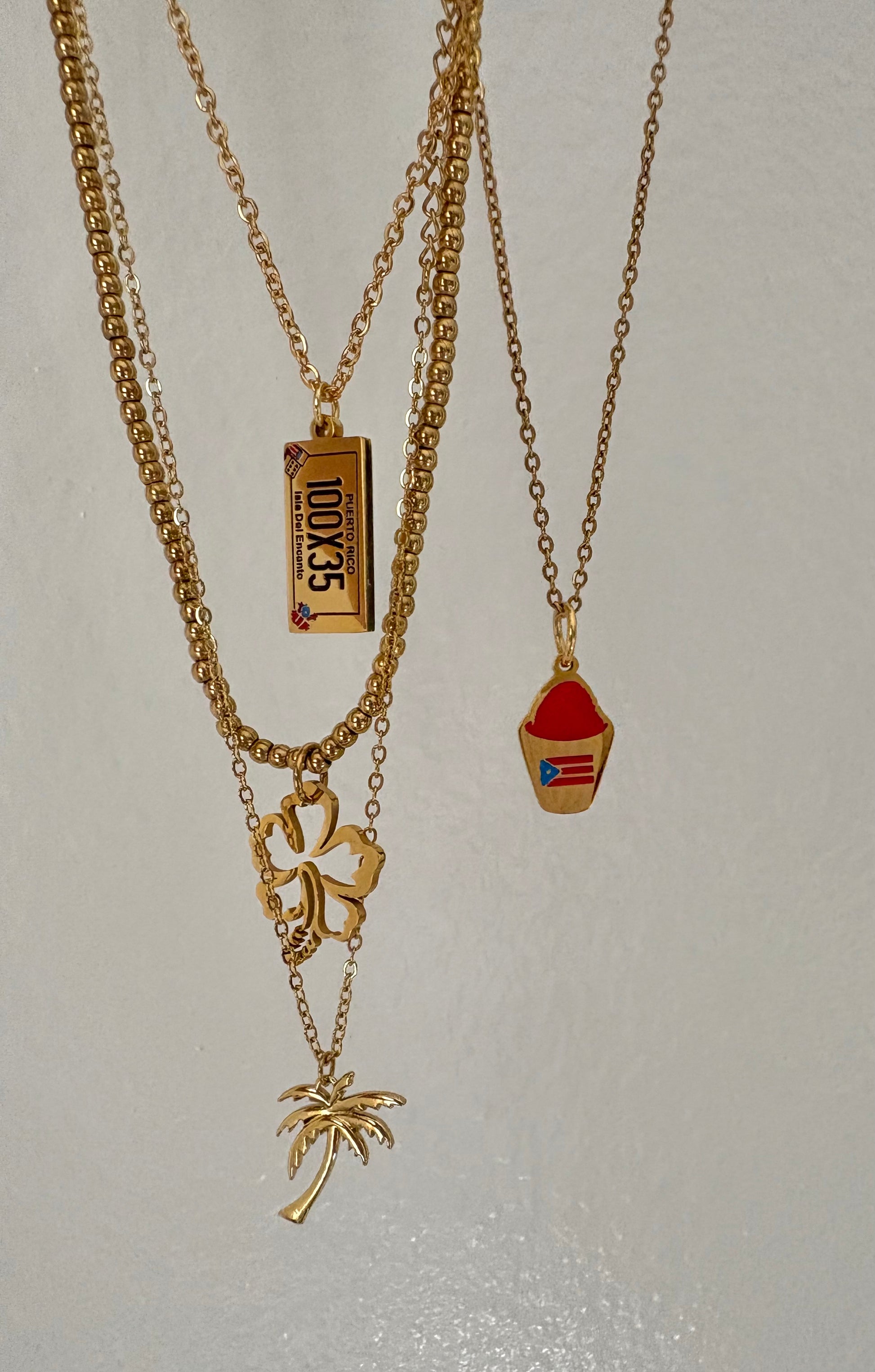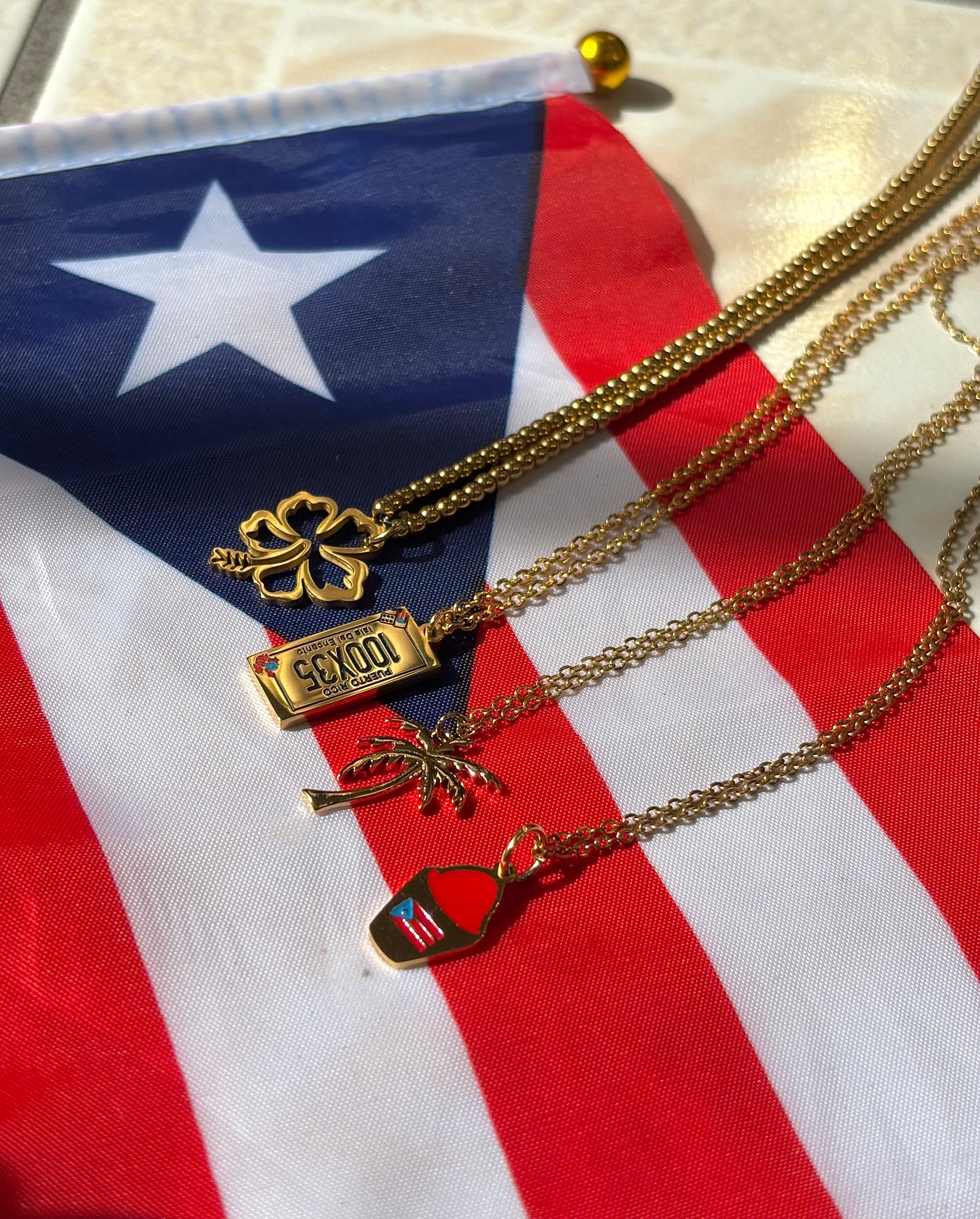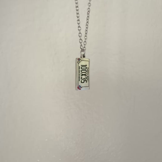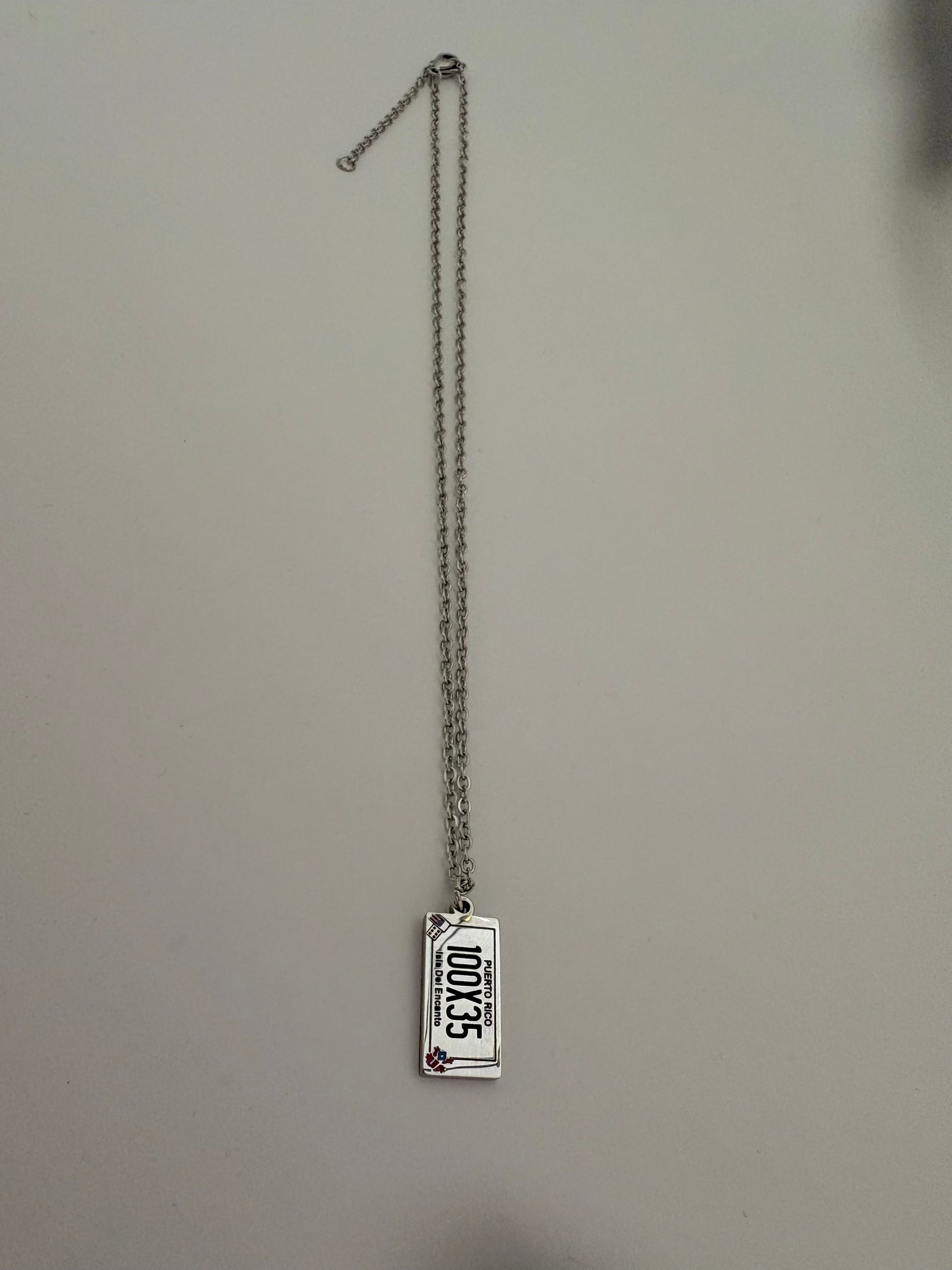 Hermosa cadena en forma de tablilla de Puerto Rico y sus escritos. Con detalles como la medida de la isla 100 x 35, el coquí y unos dominos. Elaborada en acero inoxidable. Disponibles en tonalidades plata y oro.