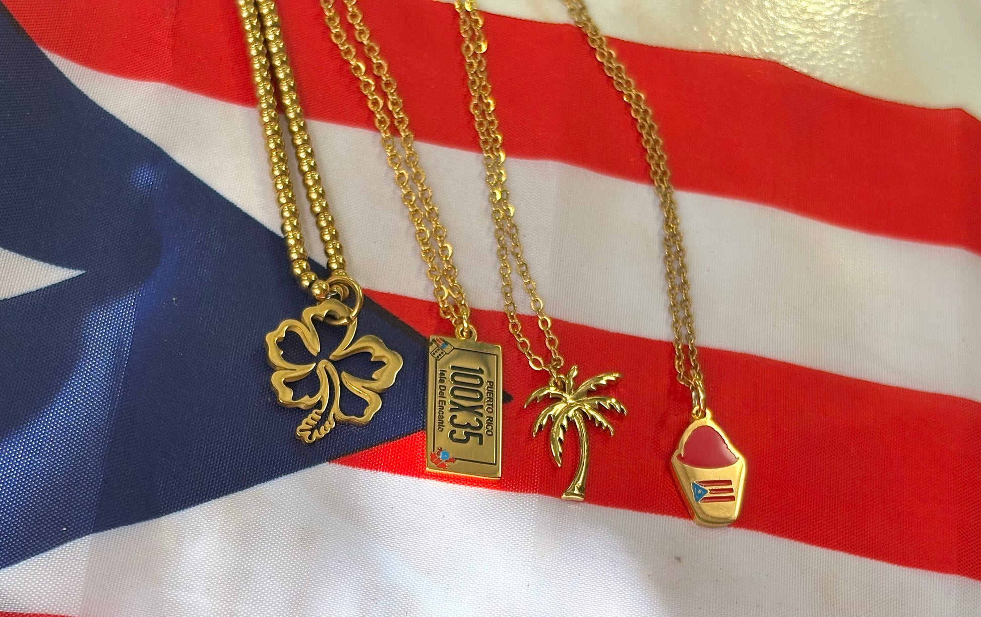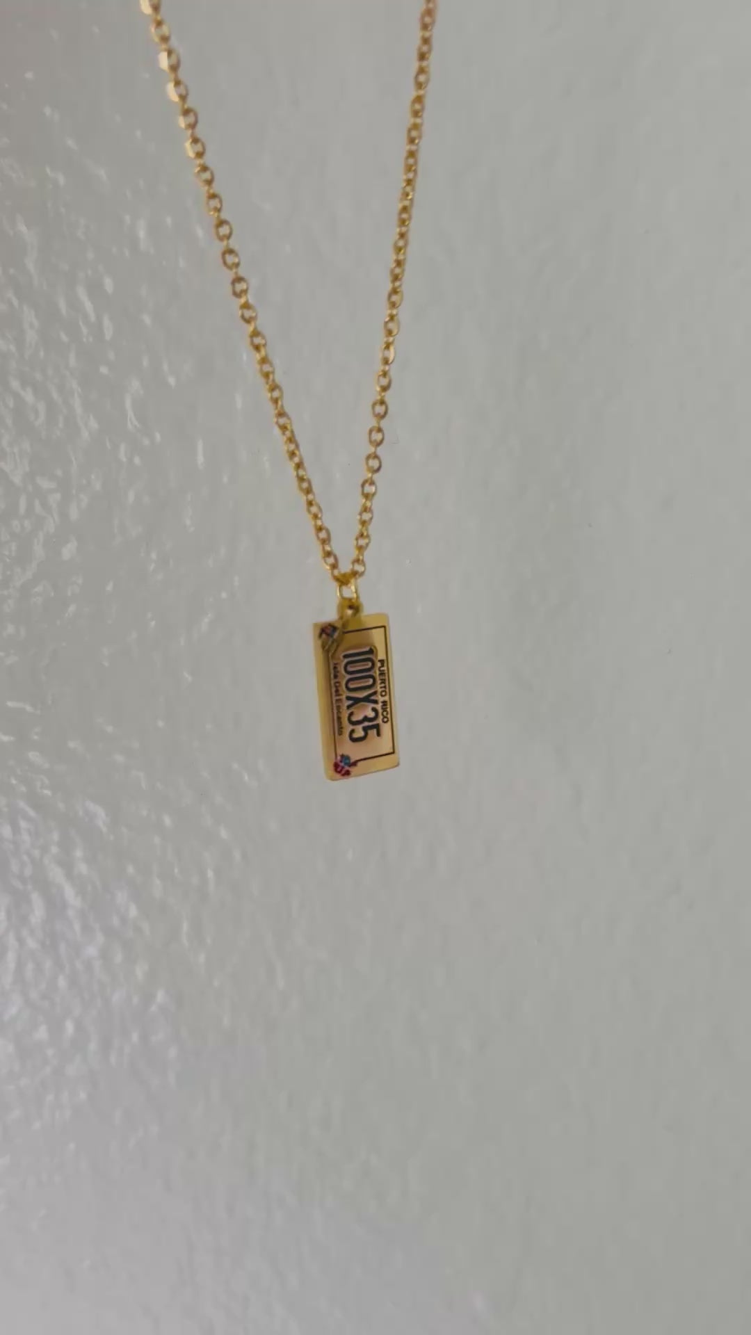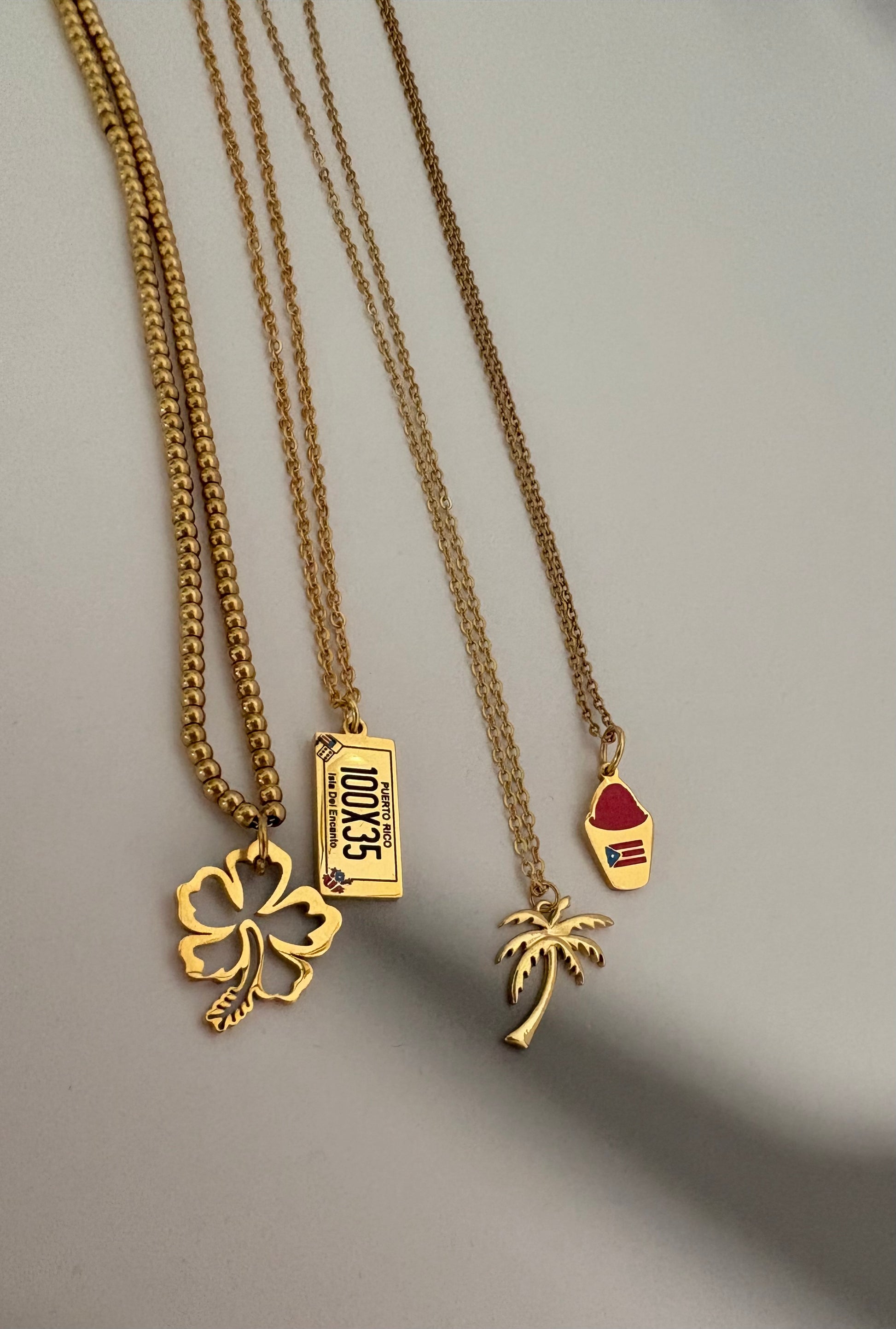Hermosa cadena en forma de tablilla de Puerto Rico y sus escritos. Con detalles como la medida de la isla 100 x 35, el coquí y unos dominos. Elaborada en acero inoxidable. Disponibles en tonalidades plata y oro.