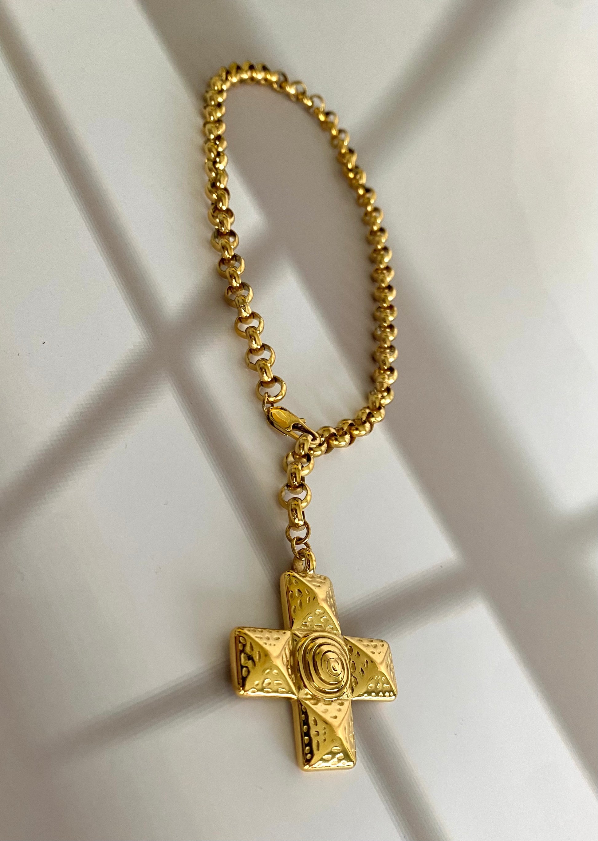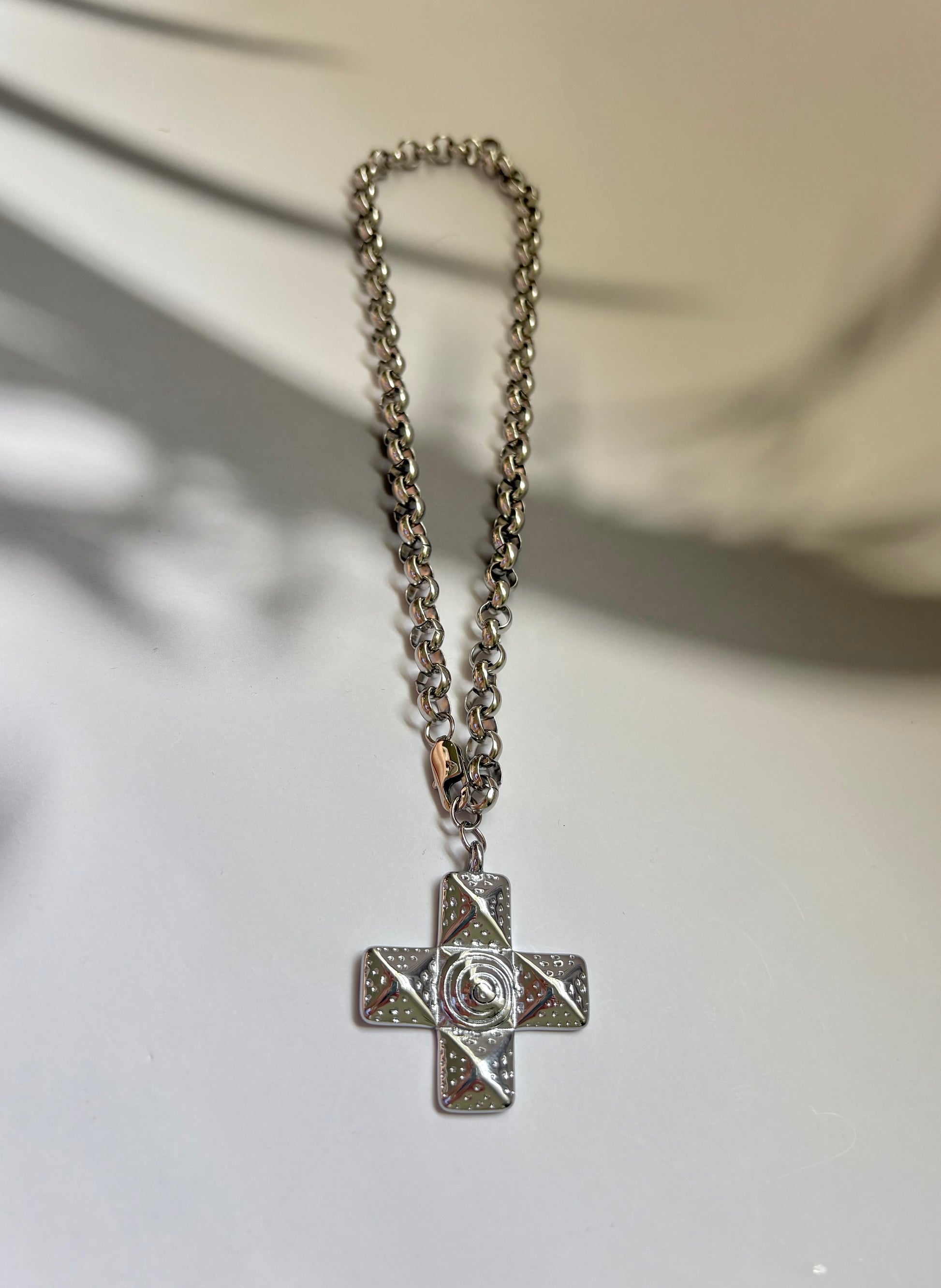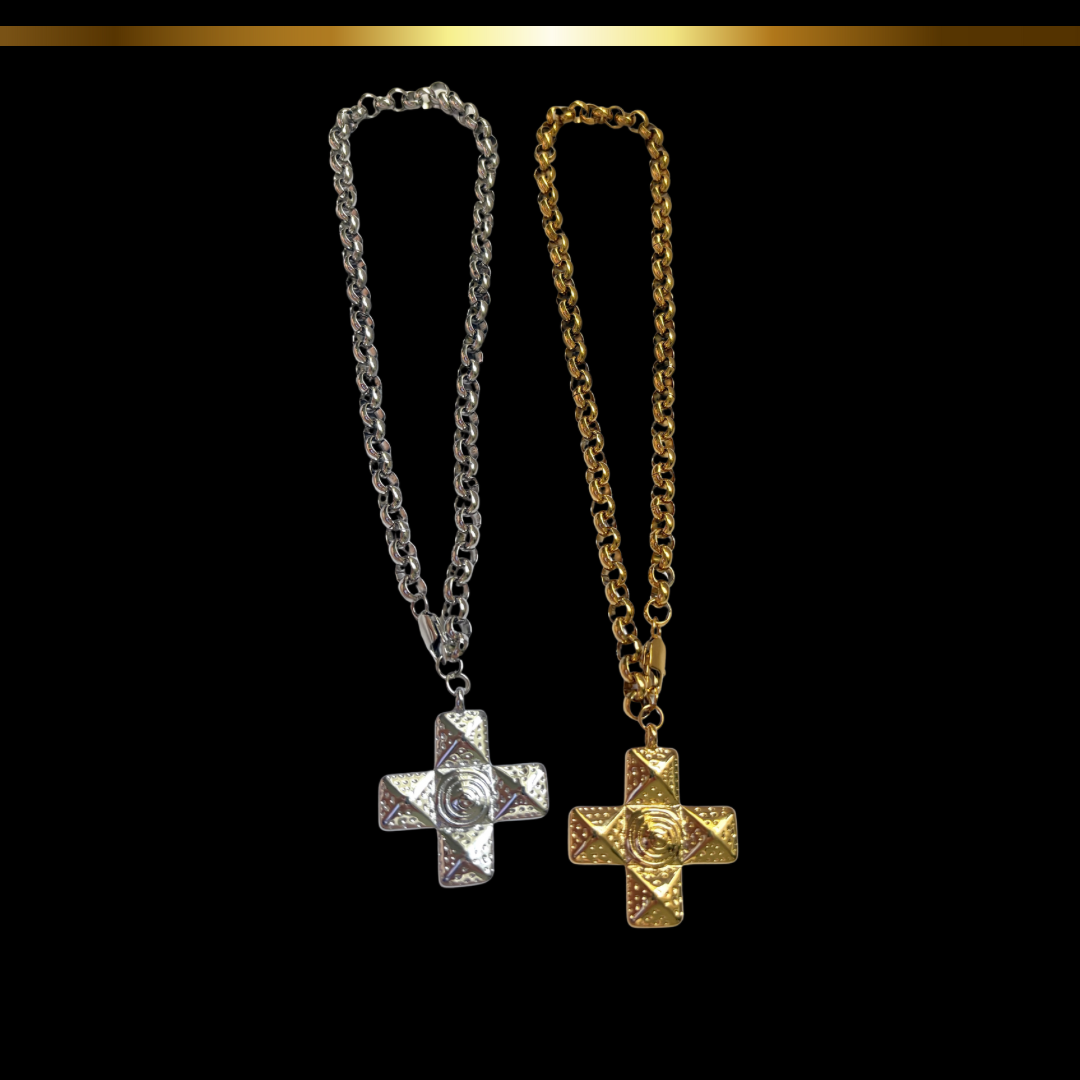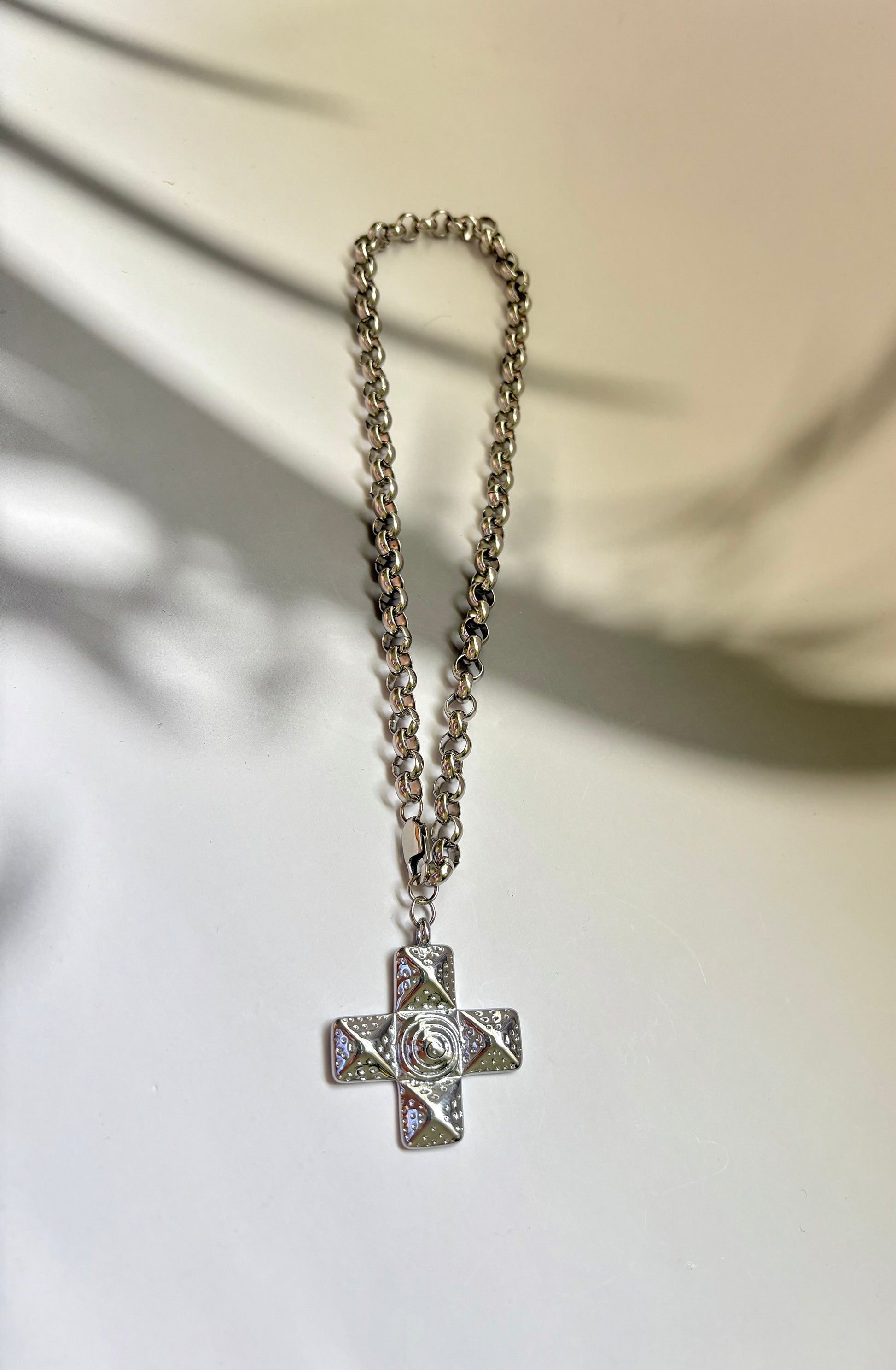 Deslumbrante cadena en eslabones pequeños y gruesos con cierre en la parte de al frente y hermoso pendiente en cruz. Elaborada en acero inoxidable.