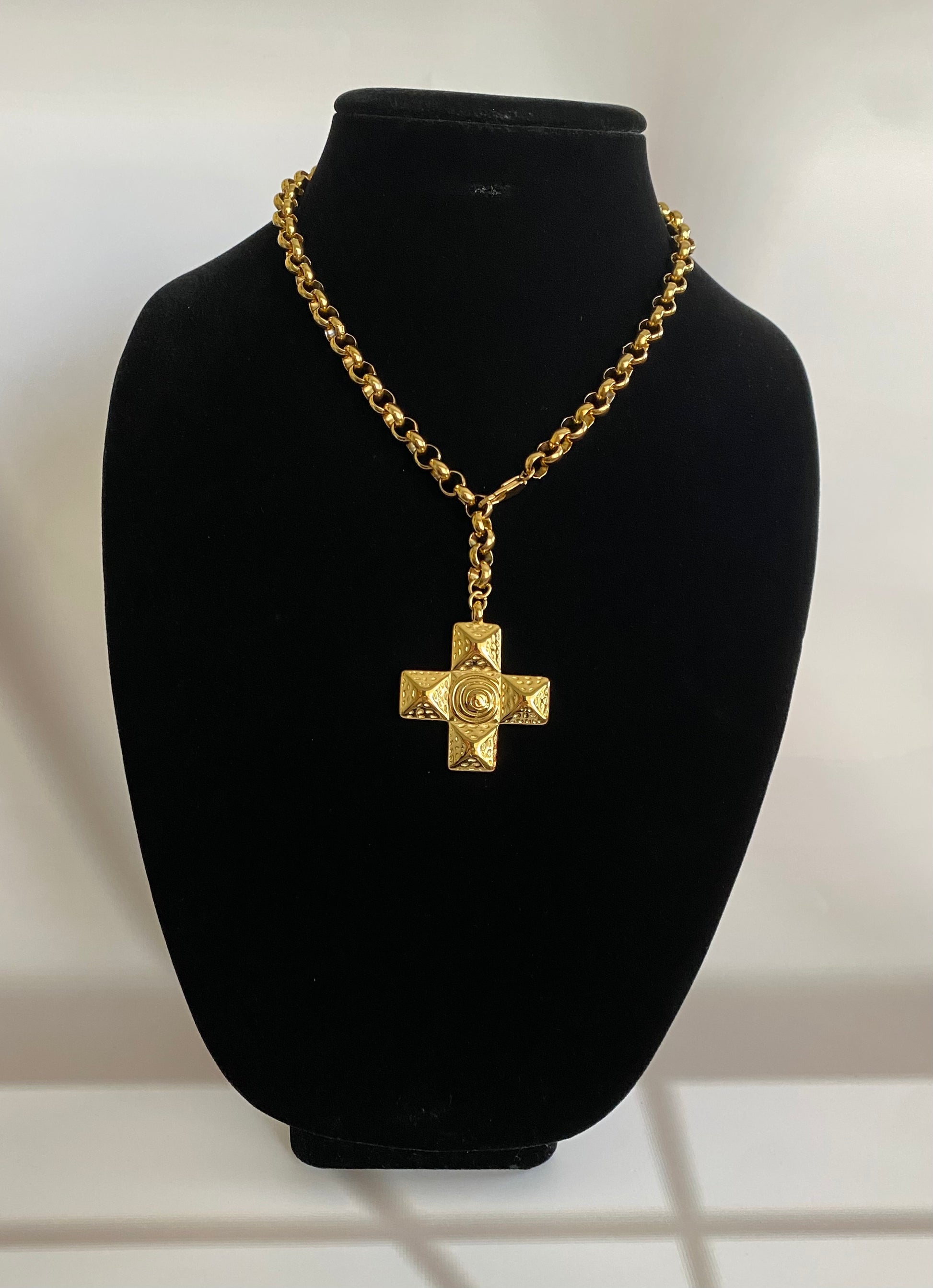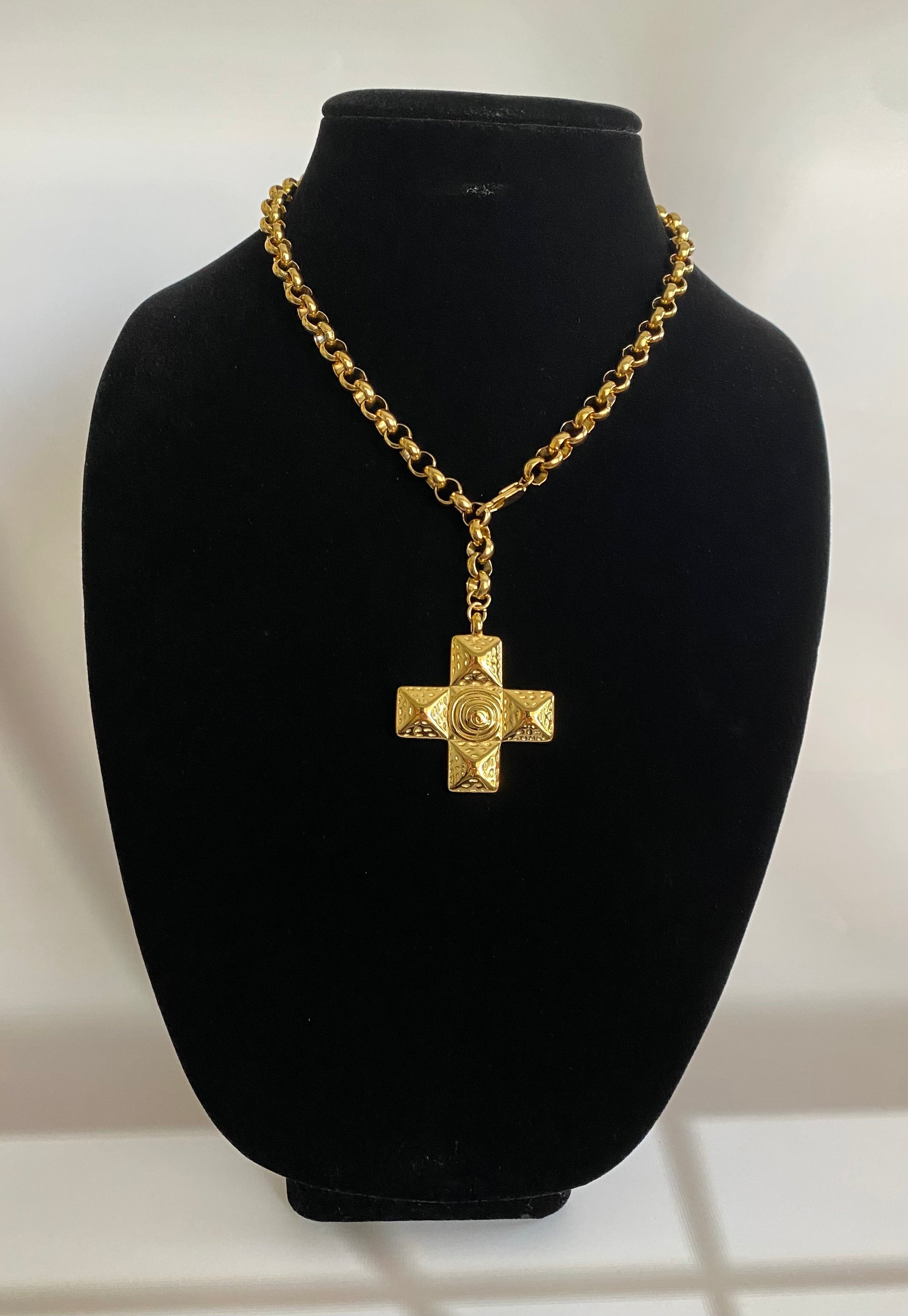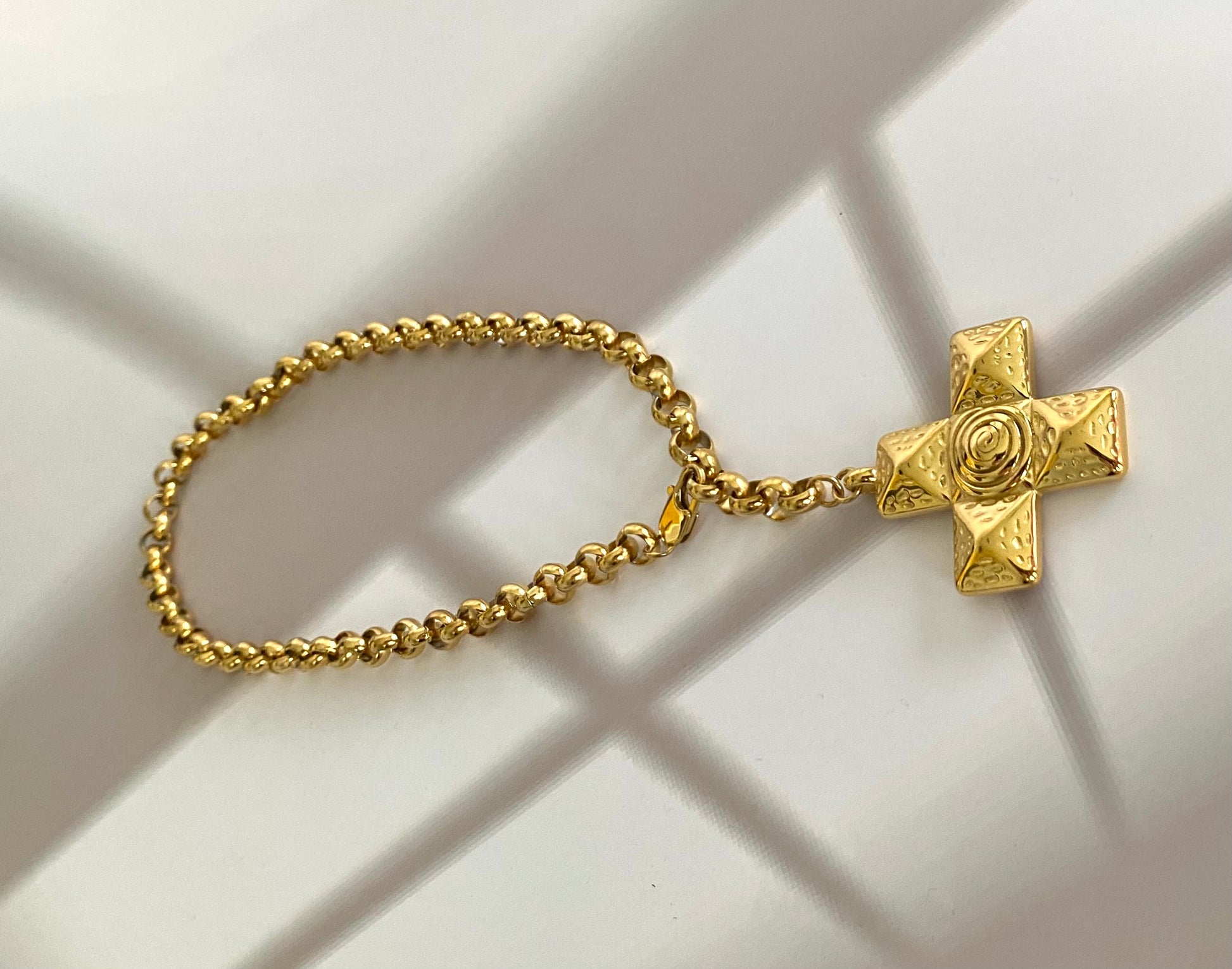 Deslumbrante cadena en eslabones pequeños y gruesos con cierre en la parte de al frente y hermoso pendiente en cruz. Elaborada en acero inoxidable.