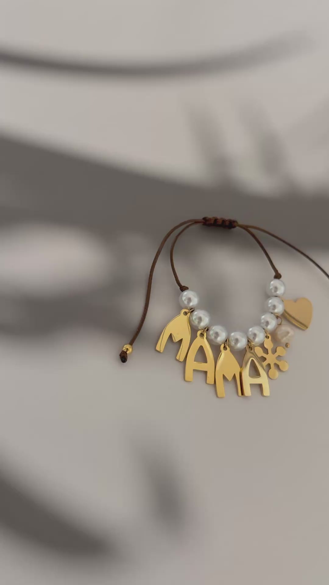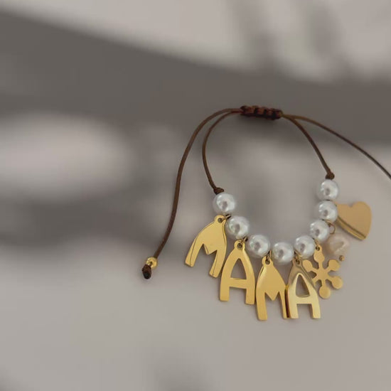 Hermosa pulsera ajustable en cordón marrón con la palabra Mamá y detalles en metal y perlas. Elaborada en acero inoxidable.